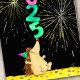 Este cartão de Ano Novo 2025 apresenta um ouriço fofo desenhado à mão vestindo um chapéu de festa listrado e equilibrando os números 2, 0, 2 e 5 no nariz. Fogos de artifício explodem em frente a um fundo preto.