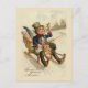 Desenhado por Susan Epps Oliver. Cartão de Ano Novo francês Vintage mostrando um anjo-menino cavalgando em um trenó e soprando a buzina. Ele está carregando uma vara de pesca e vários outros presentes embrulhados. Parece que está se divertindo!