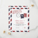 Cartão de Antecipação de Data Inspirado em Correio Aéreo em Vermelho e Azul. Marca de Selo Falso e Marcações de Postagem para um Casamento com Tema de Viagem.