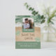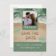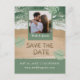 Ambiente de praia moderno em verde sálvia e azul ciano com foto, salve a data em letras de areia e foto personalizada. NOTA: O texto, a fonte, as cores e os elementos são totalmente personalizáveis com a ferramenta de design.