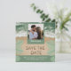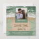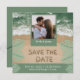 Vibrações modernas de praia em verde sálvia e azul turquesa com foto, data de salvamento em letras de areia e foto personalizada. NOTA: Texto, fonte, cores e elementos são totalmente personalizáveis usando a ferramenta de design.