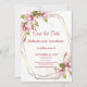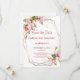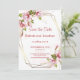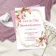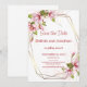 Cartão de anúncio de casamento com flores elegantes e moldura geométrica moderna. Este design é perfeito para casamentos românticos de primavera ou jardim e funciona lindamente para temas de casamento clássicos e florais. O cartão é personalizável com seus nomes, data e local do casamento.