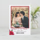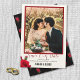 Cartões de aviso prévio de casamento com modelo de foto. Toda a redação está na parte inferior, em fontes script e impressas pretas. Os primeiros nomes do casal se destacam em texto maiúsculo impresso em negrito. Uma rosa vermelha realista e um botão de rosa decoram o canto inferior. Adicione uma foto vertical (retrato) para obter os melhores resultados. Escolha também a opção de download instantâneo para compartilhar anúncios de casamento online. O verso é preto com um padrão de hastes de rosa.