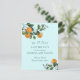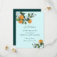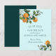 Elegante e vibrante cartão de Anúncio de Data de Casamento com uma ilustração colorida de um ramo de laranjeira com flores, frutas e folhas. Este design colorido é ótimo para um casamento com tema cítrico, casamento de verão, casamento de primavera, casamento no jardim, casamento botânico ou casamento ao ar livre. A paleta de cores é suave e moderna. O visual geral é moderno, mas elegante e sofisticado, com um toque de estilo de casa de fazenda.