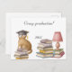 Um gato engraçado e fofo com um chapéu de formatura com uma pilha de livros e uma luminária de mesa.