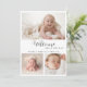 Compartilhe sua alegre notícia com este cartão de nascimento de colagem de fotos moderno! Apresentando uma grande foto de cima e duas menores abaixo, bem-vindas à sua pequena (como 'Emily Hatway') no estilo. Inclui o elegante roteiro 'Bem-vindo' e espaço para todos os detalhes importantes sobre o nascimento. Uma bela maneira de apresentar seu bebê aos amigos e à família.