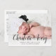 Este lindo cartão de anúncio de nascimento apresenta um nome destacado e uma grande foto. Na frente do cartão, você pode adicionar uma foto horizontal que ocupa toda a área da frente com a imagem do seu recém-nascido. A frente também apresenta uma sobreposição de texto preto que exibe o nome do seu bebê em caligrafia moderna. Abaixo, adicione os detalhes do nascimento e seus nomes. No verso do cartão, você encontrará espaço para escrever uma mensagem personalizada mais longa para os entes queridos.