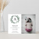 Cartão de Anúncio de Nascimento da Garota do Wreath Monogramas. Anuncie seu pacote de alegria com este bonito cartão de anúncio do monograma verde da coroa. Personalize com a foto do seu bebê, edite o filtro da foto, mude as fontes e as cores da fonte e adicione as suas próprias informações para personalizar este cartão com os seus toques especiais.