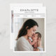 Este charmoso e moderno cartão de nascimento mostra uma foto do bebê na frente, juntamente com as estatísticas de natalidade essenciais. No verso, você pode incluir outra imagem e uma mensagem personalizada.