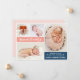 Cartões de Colagem de Fotos, Modernos, Leves Girly Coral e Bebê Marinho. Cartão modelo de anúncio elegante, de dois lados, com fotos de nascimento, apresentando quatro (4) de suas fotos favoritas na frente, com um bonito roteiro escrito à mão em branco sobre o vermelho-coral claro e os blocos de cor azul-marinho. Adicione o nome do seu bebê à frente e à natalidade. No verso há uma foto horizontal de bebê sobre fundo branco rosado e roxo. Você pode personalizá-lo facilmente.
