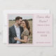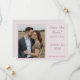O design apresenta a foto que você fornece como design principal exibida contra um fundo rosa pálido e emoldurada por uma borda elegante de cor rosa poeirento. À direita da foto, seu texto contendo título, nomes e cidade e estado do casamento são exibidos em uma fonte rosa poeirento correspondente.