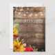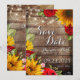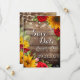 Cartão de Anúncio de Noivado Girassol e Rosas. Anuncie seu noivado com estilo com nosso Cartão de Anúncio de Casamento Rústico. Apresenta um fundo de madeira marrom com folhagens espalhadas por toda parte, bem como girassóis amarelos e rosas vermelhas.