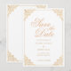 Cartão de Nikah Islâmico em ouro branco para salvar a data. Este é um anúncio em estilo barroco vintage para casais muçulmanos que pode ser usado para as suas cerimônias de Mehndi e Walima. Você pode personalizar a cor, o tipo e o tamanho das fontes usando o menu fácil de usar da Zazzle. Você pode editar todas as informações escritas. O tipo de papel pode ser alterado por si. Confira outros produtos desta coleção de falso ouro vintage visitando a loja HerLineForDesign neste site.