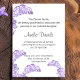 Cartões de anúncio de funeral elegantes com campainhas selvagens em tons de lilás e roxo. Estas cartas são desenhadas para honrar e celebrar a vida do seu amado com graça e beleza.