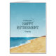 Cartão de aposentadoria feliz com praia ensolarada e mar.