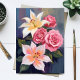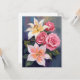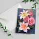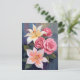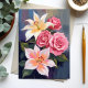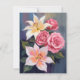 Cartão floral de aquarela com buquê de rosas cor-de-rosa e lírios brancos pintado