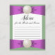 Solicite conselhos de casamento aos seus amigos e familiares em estilo com alguns bonitos cartões de aconselhamento personalizados. Este cartão de nota com uma pérola encantadora e design de fita púrpura lilás em um sábio sereno verde pode ser entregue aos seus convidados no dia especial. Embora este cartão de conselho fosse um toque maravilhoso para qualquer estação, o lilás floral, as cores do sábio e a pérola brilhante seriam lindamente ajustado um casamento de primavera. Os nomes da noiva e do noivo podem ser exibidos elegantemente na frente do cartão. Inclua monogramas da noiva e do noivo na parte traseira da placa.
