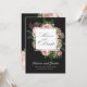 Convite elegante com rosas cor-de-rosa e folhagem verde exuberante em estilo vintage sobre um fundo preto fosco. Combinado com fonte serifada que é facilmente personalizável para suas necessidades e bordas de rosas, esta é uma escolha perfeita para qualquer estação. Isso será adequado para um casamento black tie ou apenas puro e elegante com acentos florais.