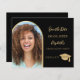 Na frente: Adicione sua própria foto vertical do formando. Uma moldura de arco de foto em dourado falso. Um fundo preto clássico, texto dourado. Modelos para nome e data. O nome e o texto: Salve a data estão escritos com uma fonte moderna de letra manuscrita. Com um boné, pendente de borla.