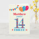 Um cartão de aniversário colorido para uma criança de 14 anos para você personalizar com um nome, O grande número 14 está cheio de um padrão laranja, vermelho e azul, esboçado em azul brilhante. Há balões e bunting no topo, em cores correspondentes e a saudação do cobrir dianteiro é, '(Nome aqui), você tem 14 anos hoje!' em letras brilhantes vermelhas e azuis, em um fundo bolinhas amarelo e branco muito pálido, com estrelas vermelhas e laranja em cada lado da palavra 'HOJE!'. A mensagem dentro pode ser facilmente personalizada ou excluída se você desejar.