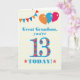 Um cartão de aniversário colorido para um neto excelente de 13 anos, O grande número 13 está cheio de um padrão laranja, vermelho e azul, esboçado em azul brilhante. Há balões e bunting no topo, em cores coincidentes e a saudação do cobrir dianteiro é, 'neto Excelente, você tem 13 anos hoje!' em letras brilhantes vermelhas e azuis, em um fundo de bolinhas muito amarelo e branco, com estrelas vermelhas e laranja em cada lado da palavra 'HOJE!'. A mensagem dentro pode ser facilmente personalizada ou excluída se você desejar.
