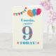 Um cartão de aniversário colorido para um primo de 9 anos, com o grande número 9 cheio de um padrão laranja, vermelho e azul, esboçado em azul brilhante. Há balões e bunting no topo, em cores coincidentes e a saudação do cobrir é, 'Primo, você está 9 hoje!' em letras azuis brilhantes, sobre um fundo bolinhas amarelo e branco muito pálido, com estrelas vermelhas e laranja em cada lado da palavra 'HOJE!'. A mensagem dentro pode ser facilmente personalizada ou excluída se você desejar.