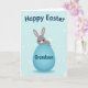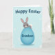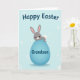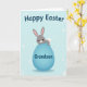Este cartão apresenta um adorável coelho cinza com orelhas internas rosa suave, olhos escuros brilhantes, um narizinho rosa e um rubor suave, dando-lhe uma aparência terna e amigável 🐰. O coelho senta-se no topo de um grande ovo oval em um azul calmo de ovo de robin, como se estivesse posando para alguém de quem gosta. A gradação suave ao longo do ovo adiciona profundidade, e uma pequena cauda branca fofa espreita por trás do coelho para dar um toque aconchegante. O fundo é azul pálido com círculos brancos espalhados e formas que lembram explosões de estrelas que parecem confetes de luz flutuando ao redor 🌷. Perto do topo, uma saudação sazonal arredondada aparece em letras escuras, centralizada acima do coelho e do ovo. No ovo azul, uma linha menor de texto é colocada na frente em uma cor mais escura contrastante, como