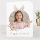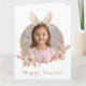 Envie votos calorosos de Páscoa com este cartão de cumprimentos personalizado com a foto do coelho da Páscoa. Com um design de coroa floral em tons pastéis na frente e uma mensagem cuidadosamente escrita no interior, este cartão torna-se um objeto significativo para as celebrações da Páscoa.