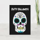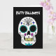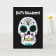 Um cartão de cumprimentos com um desenho de caveira de açúcar desenhada à mão em preto com as palavras Feliz Halloween na frente. O interior diz “Que todos os seus desejos assustadores se tornem realidade.”