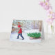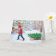 Este Cartão de Natal foi criado a partir de uma fotografia de um menino e um trenó com uma floresta coberta de neve ao fundo. Eu adicionei a árvore de Natal recém-cortada ao trenó e um pássaro cardinal. (Menino trazendo a árvore de Natal para casa) Há uma saudação interna "Que seu lar seja quente e cheio de amor no Dia de Natal."