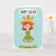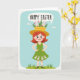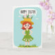 Este cartão de cumprimentos apresenta uma garota animada de cabelos vermelhos mostrada de corpo inteiro com as mãos nas ancas, sorrindo amplamente com círculos rosados nas bochechas como se estivesse compartilhando uma piada amigável e afetuosa. Ela usa um vestido verde-limão, e ao longo da barra uma fileira de pequenas criaturas brancas de orelhas compridas espiam como se estivessem lhe fazendo companhia 🐰. Um chapéu amarelo de abas largas está sobre sua cabeça, coberto com um pequeno jardim de folhas verdes ricas e pequenas flores cor-de-rosa, onde mais amigos de orelhas compridas surgem e se inclinam em sua direção como se atraídos por sua energia alegre 🐇. Atrás dela, um céu azul pastel suave com nuvens pálidas e flutuantes cria uma cena calma de primavera, enquanto uma faixa de grama verde fixa a imagem na parte inferior. Perto do topo, uma grande bolha de fala domina o espaço, contendo uma saudação sazonal em letras grossas desenhadas à mão. O texto está centrado dentro da bolha e aparece em