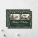 Cartão de Boas Festas elegante verde e dourado com foto, apresentando azevinho dourado em um fundo verde escuro. Personalize facilmente este cartão de Natal com foto com suas fotos favoritas e o nome da família.