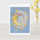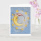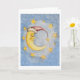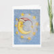 Cartão de cumprimentos inspirado no vintage com uma ilustração de uma lua crescente adormecida rodeada por um anel de estrelas. Este cartão é perfeito para enviar cumprimentos durante as festas, mas também funciona em qualquer época do ano!