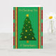 Cartão de Boas Festas de árvore de Natal clássica adornada com ornamentos dourados e estrela cintilante no topo. Vermelhos, verdes e dourados bordam o desenho; mensagens "Oh Christmas Tree" e "O Tannenbaum" enquadram a árvore.