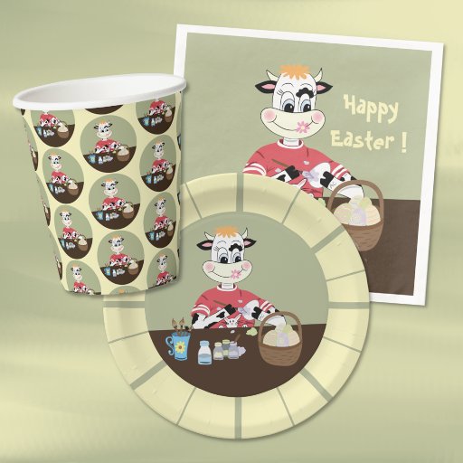 Um cartão de Páscoa simpático para crianças com uma vaca de desenho animado chamada Snowbell, pintando ovos de Páscoa.