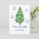 Cartão de Natal Paz na Terra. Você pode personalizar este cartão. Design de Aquarela por Cathy Thompson Art. Árvore de Pinheiro Verde com Enfeites e Estrelas.