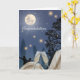 Uma lua cheia brilha intensamente sobre silhuetas dançando sob um céu estrelado. Duas taças de champanhe estão cheias de bolhas em primeiro plano. O cartão diz "Parabéns" na frente em caligrafia.