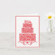 Cartão de felicitações de casamento é mostrado com uma impressão gráfica de bolo vermelho sofisticado.