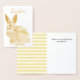 Cartão bonito de Páscoa feito em branco com um coelho de folha de ouro feito em padrões. Um padrão chevron amarelo e branco decora o dentro à esquerda da placa. Personalize o texto personalizado para atender às suas necessidades.