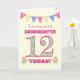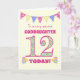 Um bonito cartão de aniversário de 12 anos para a sua afilhada, com bunting de bolinhas, flores de primavera e números preenchidos com um padrão de primavera, tudo sobre um fundo xadrez amarelo pálido. A mensagem da capa é 'Para uma AFILHADA muito especial, 12 HOJE!'. A mensagem interna é apenas uma sugestão e você pode personalizá-la facilmente ou excluí-la se preferir.
