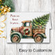 Na frente deste cartão de Cartões de natal bonito, um caminhão de fazenda com estilo retrô é decorado com uma coroa de Natal e carregares em casa, uma árvore cada verde recentemente cortada. Um pequeno cão de Corgi, castanho e branco, espreita para fora da parte de trás do caminhão. O texto vermelho de um lado diz "Da nossa casa à sua...", e o sentimento continua a ser dentro. Todo o texto, frente e dentro, pode ser facilmente personalizado por você para dizer o que quiser.