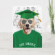 Cachorro recuperador de ouros em camiseta verde, óculos de sol aviador e chapéu de graduação verde para parabéns formandos.