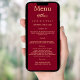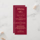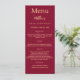Cartão de menu de festa de aniversário. Personalize e adicione um nome, idade, data e menu. Um fundo burguês. Letras coloridas com ouro. Voltar: adicione uma foto da cara de aniversário, fatos divertidos