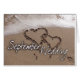 Dois corações na areia com ondas de oceano e casamento de setembro na pia batismal branca do roteiro. Aperfeiçoe o design para anunciar seu próximo casamento. Ame na praia!