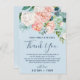 Este cartão de agradecimento de casamento com peônias românticas azul claro é perfeito para um casamento elegante. O design floral apresenta flores em aquarela em tons de rosa, pêssego e branco em cascata sobre um fundo azul claro. Coloque esses cartões na mesa para cada um dos seus convidados na recepção do seu casamento. Personalize o cartão com seus nomes e uma mensagem especial de agradecimento.