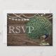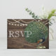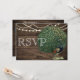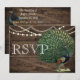 Cartão de Casamento de Pavão com Pena Azul Turquesa em Madeira Rústica