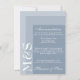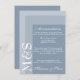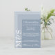 Simples cartão de cerimônia de casamento com guião chic moderno para acomodações, noivas que estão adorando suas cerimônias em um estilo moderno e cor azul empoeirada. A suíte de casamento chic tem uma fonte branca moderna com monograma de iniciais ao lado.