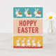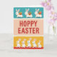 Este desenho mostra uma cena de três painéis com coelhos brancos de orelhas compridas se movendo por uma ambientação primaveril 🐇. No painel superior, três coelhos idênticos caminham lado a lado sobre um fundo azul-turquesa, cada um segurando uma cesta tecida repleta de ovos manchados e pequenas flores 🌷. A suave inclinação para frente e a proximidade entre eles sugerem que estão entregando presentes juntos, como amigos próximos compartilhando uma missão silenciosa. No meio, uma ampla faixa cor de pêssego carrega as palavras “HOPPY EASTER” em letras vermelhas grossas centralizadas de forma proeminente. O painel inferior mostra cinco coelhos em uma fila de marcha, diminuindo de tamanho da esquerda para a direita para criar profundidade, como se estivessem se dirigindo um ao outro à distância. Cada coelho usa uma gravata de cor diferente, adicionando um toque doce e afetuoso à sua caminhada coordenada. Eles caminham sobre uma