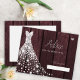 Vestido de casamento de diamantes brancos em um fazer de fundo de madeira de burro escuro, um simples cartão de chá de panela elegante moderno.