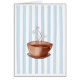 Ilustração de uma xícara de café calmante, cozida, colocada sobre um fundo listrado azul e branco. Perfeito para usar como convite para almoçar, tomar café ou apenas para se juntar aos amigos apaixonados pela cafeína! Também corresponde ao: